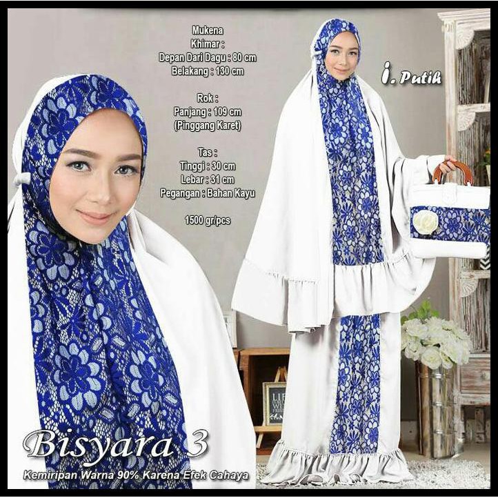 Penawaran MenarikNEW COLLECTION MUKENA BISYARA PUTIH BRUKAT BIRU+WOLVIS,HANDLE KAYU,HIGH QUALITY REALP PALING MURAH ayo segera diambil